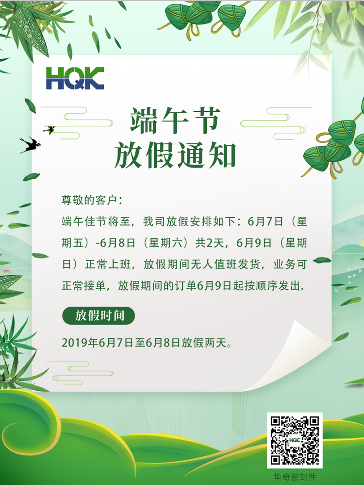 端午佳節將至,我司放假安排如下:6月7日(星期五)-6月8日(星期六)共2天,6月9日(星期日)正常上班,放假期間無人值班發貨,業務可正常接單,放假期間的訂單6月9日起按順序發出。感謝您一如既往對我們工作的支持與信任!華奇密封祝您:節日安康!生意興隆!